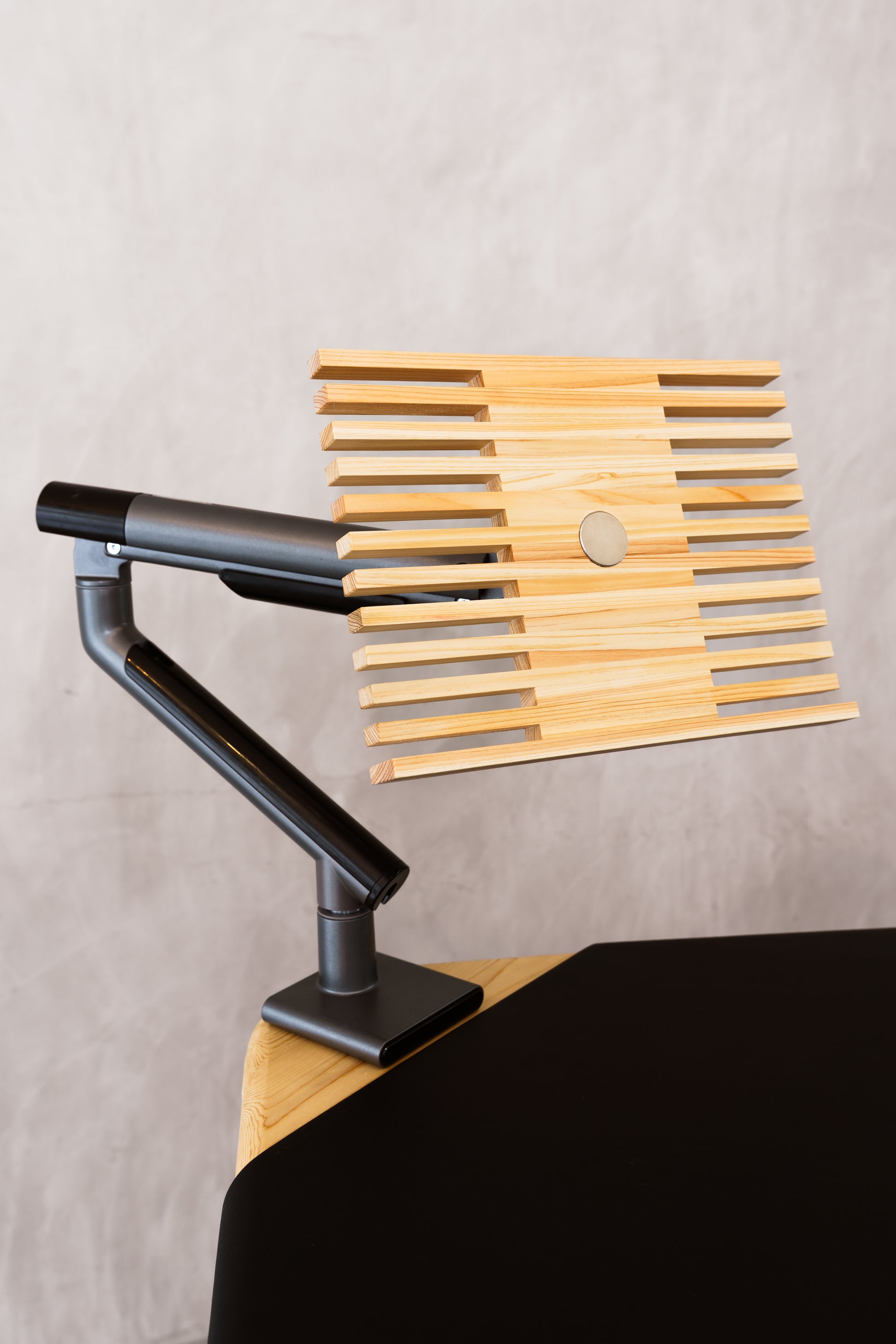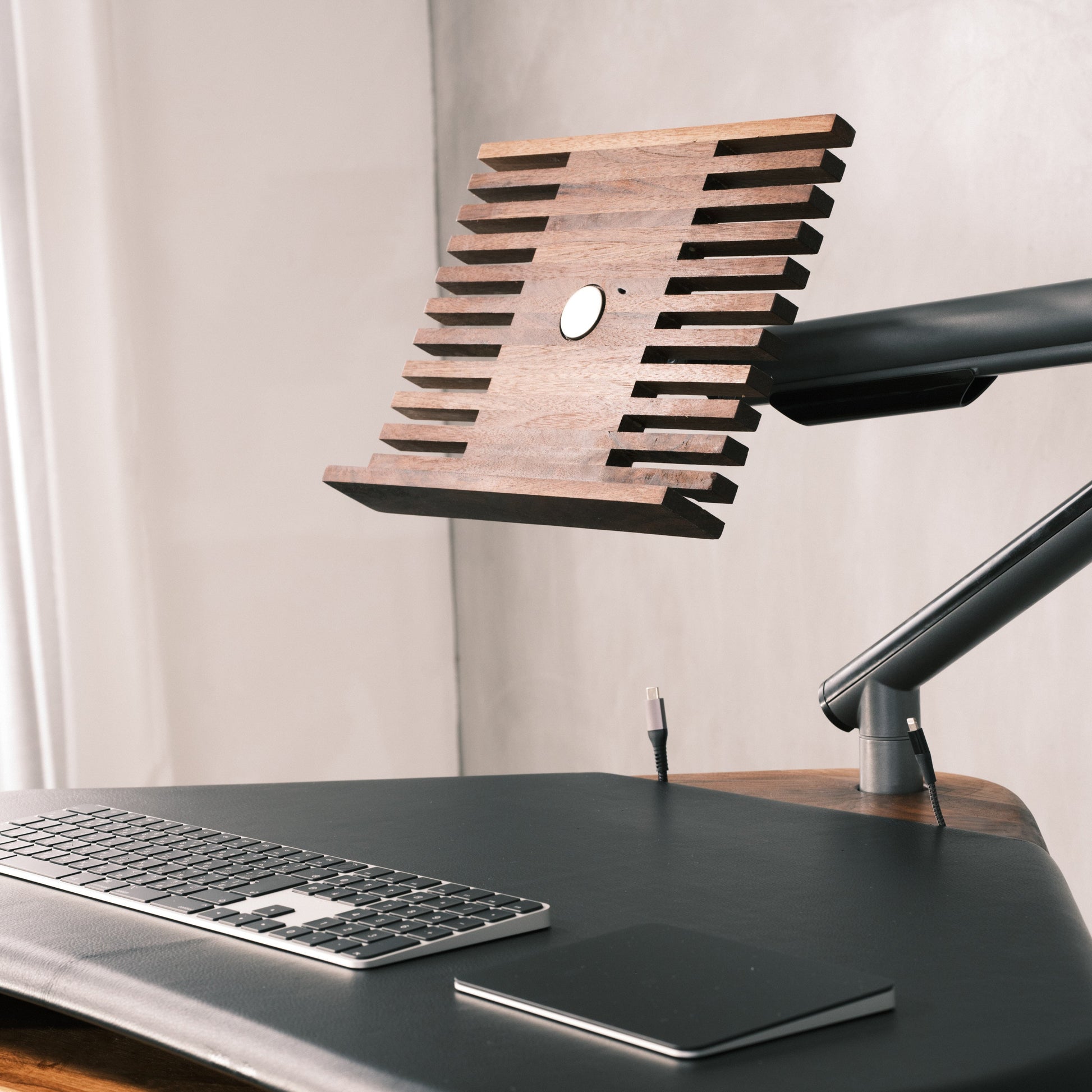 Solid wood tray to place tablet like an iPad or a laptop on. It can be used with any monitor arm that is VESA compatible. The wood strain will be matched with the TANKEN The Standing Desk it is bought with.